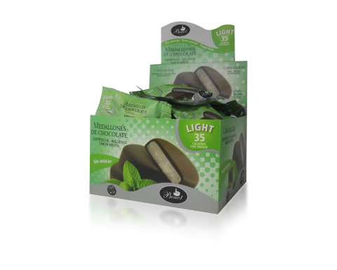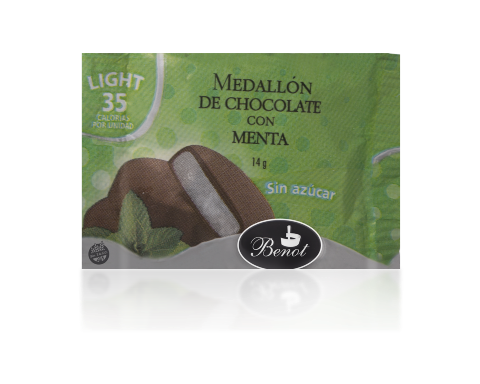 Medallón de chocolate relleno dietético modificado en su composición glucídica sin azúcar agregada sabor menta y libres de gluten